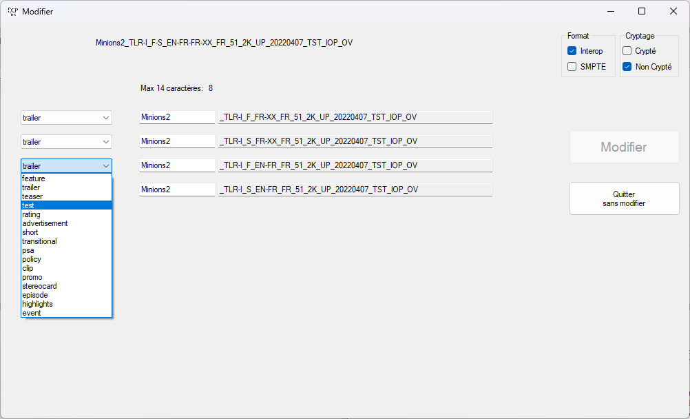 Si le nom est conforme à la Convention de Nommage du Cinéma Numérique, page officielle en anglais et sa traduction en français , seul le premier champ est modifiable (les caractères tout à fait à gauche avant le premier caractère de soulignement « _ »).