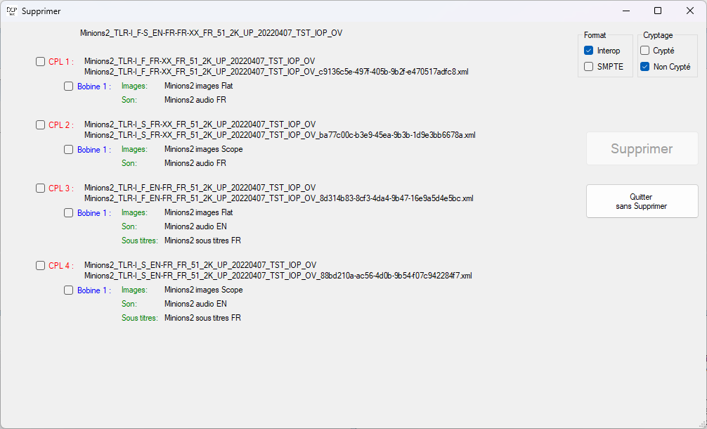 - des bobines, c’est à dire des ensembles Images, Audio et éventuellement Sous-titres d’une CPL mais il doit en rester au moins une par CPL.
