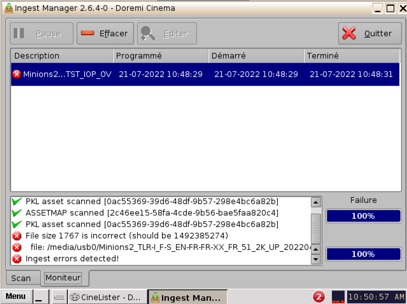 Et de faire les corrections éventuelles des problèmes de capacité et de sommes de contrôle rencontrés dans les fichiers CPL et/ou PKL et/ou ASSETMAP après avoir sauvegardé les originaux.