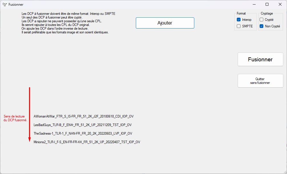 - On ne peut fusionner que des DCP du même format INTEROP ou SMPTE.